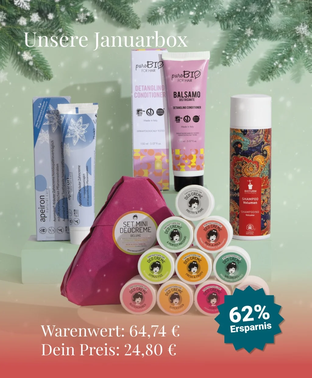 In unserer Beauty Box erwarten dich immer wieder neue Marken und spannende Produkte vom herrlich duftenden Duschgel, über pflegende Bodylotion bis zum wohltuenden Körperöl. Freu dich auch auf sanfte und doch effektive Deos, wundervolle Haarpflege-Produkte und die neuesten Farb- und Make-up Trends aus dem Bereich der dekorativen Kosmetik.